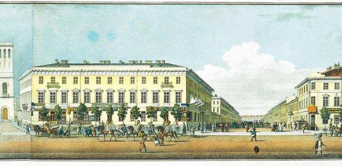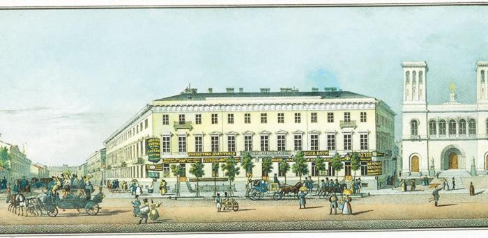 Великолепный вид, который встретил Иммануила по приезде в Санкт-Петербург: Невский проспект у Немецкой церкви. Справа улица Малая Конюшенная, где находилась шведская церковь и проживали шведы и другие выходцы из скандинавских стран. Акварель 1828 года. Неизвестный художник