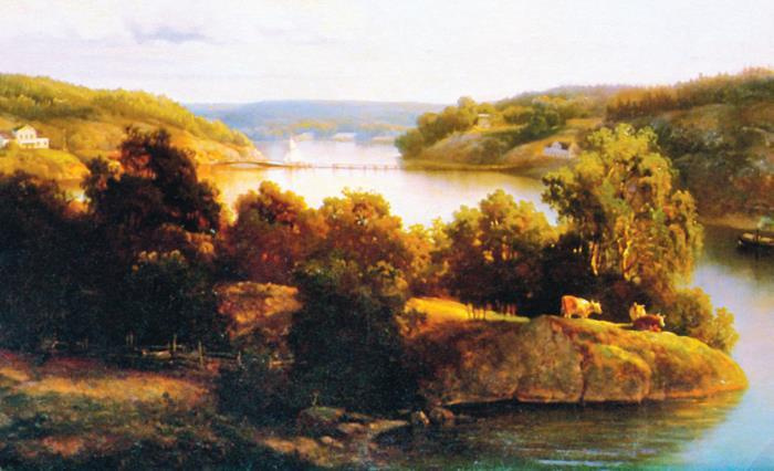 Плавучий мост Скуру, который в 1915 году был заменен бетонным мостом. Картина Жозефины Холмлунд, 1868 год