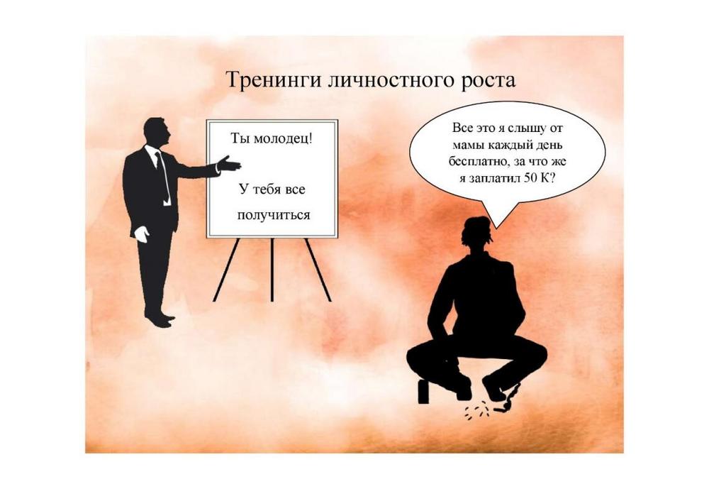 Если вам предлагают кардинально изменить жизнь и свой образ мышления, то вы наткнулись на плохой бизнес-тренинг. А зачем вам кардинально меняли свою жизнь? И уж тем более, зачем вам менять свое мышление? Вы это уникальный набор психофизических свойств, привычек, особенностей поведения, у вас свой неповторимый характер. Даже если вы хотите изменить свое сознание, вряд ли у вас это получится. От себя не убежишь, если более простыми словами. Ваша внутренняя структура устойчивее, чем вы думаете, она будет сопротивляться глобальным изменениям. И зачем вам менять всё? Чтобы «бизнес-тренер» залез к вам в карман? Не напоминает ли такой «бизнес-тренинг» секту?