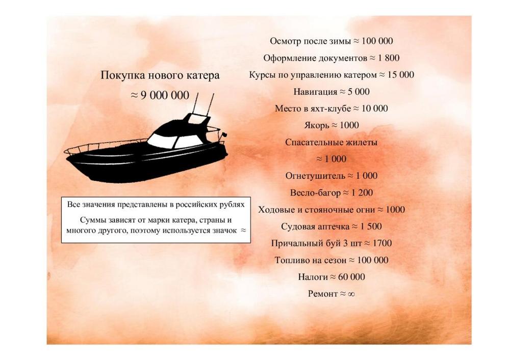 Дорогие вещи требуют дорогого ухода. Известный российский певец, живущий в США, решил приобрести катер (или моторную лодку, не суть). Всё бы ничего, пока он не узнал, сколько стоит её техобслуживание. В Лос-Анджелесе эта сумма достигает 9000 долларов в год. Во Владивостоке содержание моторной лодки тоже обходится недёшево. Её надо где-то пришвартовать, а стоянка не бесплатная. Если у вас частный дом, и лодка не слишком большая, можно загнать её на зиму в гараж. Но доставка от берега до дома тоже потребует средств. Даже если у вас есть машина для транспортировки, добавьте стоимость прицепа. Включите сюда снасти, бензин, покраску, внеплановые поломки, ремонт, и вы легко убедитесь, что стоимость покупки не так уж велика по сравнению со стоимостью её содержания. Не лучше ли сразу рассчитать затраты и доходы на перспективу?