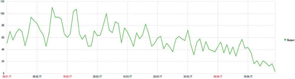 На изображении указан февраль 2016 года, далее 28 апреля 2017 года. Я не работал по проекту с февраля 2016 года, поэтому у меня не было статистики за промежуточный период, но я знаю, что сайт стабильно занимал топ-10 по основным запросам: