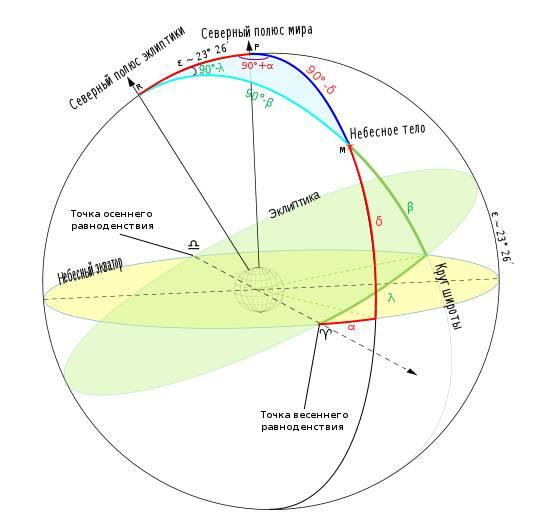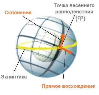 Небесный экватор, находящийся в одной плоскости с земным экватором, не совпадает с эклиптикой. Небесный экватор и эклиптика пересекаются по линии равноденствия. Отправной точкой, условным началом зодиака является точка весеннего равноденствия, обозначаемая как 0° Овна. Весь круг долготы делится на 360°, а затем на 12 знаков зодиака по 30° каждый: Овен, Телец, Близнецы, Рак, Дева, Весы, Скорпион, Стрелец, Козерог, Водолей, Рыбы. Точка осеннего равноденствия совпадает с 180°, что является 0° Весов.