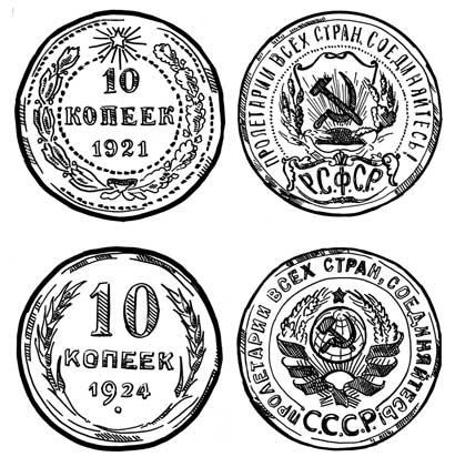 Мой прадедушка, первый советский гривенник 1921 года, был выпущен от имени Российской советской республики РСФСР. Его младший брат 1924 года рождения отчеканен с гербом Советского Союза, одно время они ходили вместе и очень ценились в народе, поскольку были серебряные.