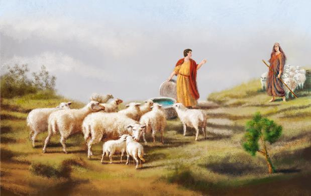Много дней шёл Иаков до Харрана. Наконец он увидел в поле колодец и лежащих возле него овец. Колодец закрывал большой камень. Иаков поздоровался с пастухами и спросил, почему они не дают овцам напиться.