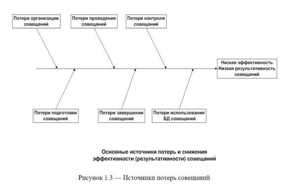 Для наглядности, эти недостатки можно представить в довольно широко распространенной форме «рыбьего скелета», на котором каждый источник потерь изображен своей «костью» и местом в общей последовательности, а все недостатки накапливаются и приводят к суммарному снижению эффективности и результативности совещаний (Рис. 1.3).