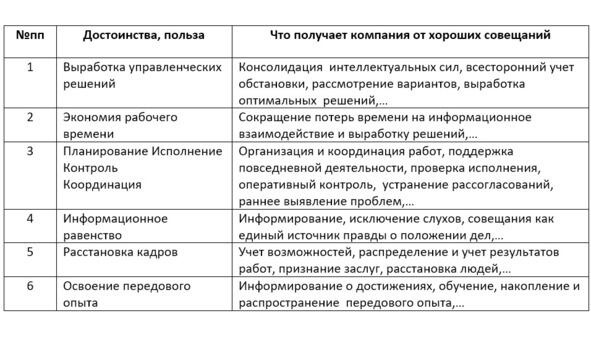 В следующей таблице приведен сводный перечень достоинств правильно организованных, уверенно проводимых и четко контролируемых служебных совещаний.