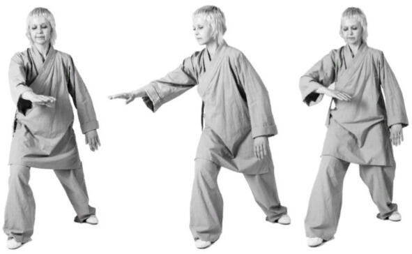 Необходимо встать в стойку гунбу, правая нога впереди. Начинаем плавные горизонтальные круговые движения правой рукой, центр круга стопа правой ноги. Ладонь на уровне печени, тело расслаблено и легко перекатывается с одной ноги на другую. Глаза смотрят на проекцию точки Лаогун на тыльной стороне кисти руки. Сделайте 9 внешних кругов рукой, потом 9 кругов в обратную сторону. Повторить тоже самое с другой ноги.