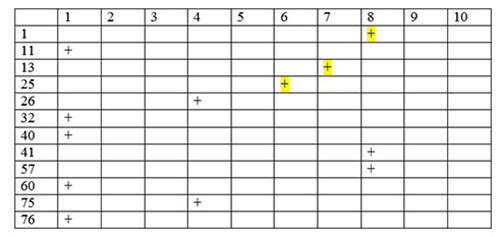 Ниже, в таблице 1, плюсиками отмечены катрены, относящиеся к Наполеону. По горизонтали в верхней строке надписаны номера центурий, от первой до десятой. По вертикали, в левом крайнем столбце указан номер наполеоновского катрена внутри центурии. Таблица 1: