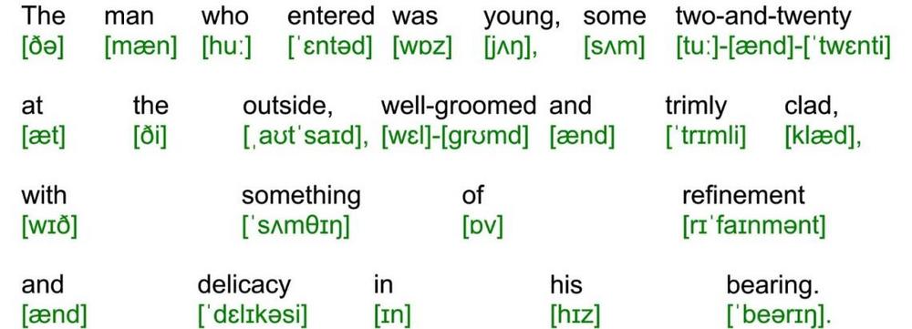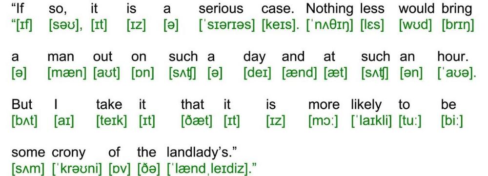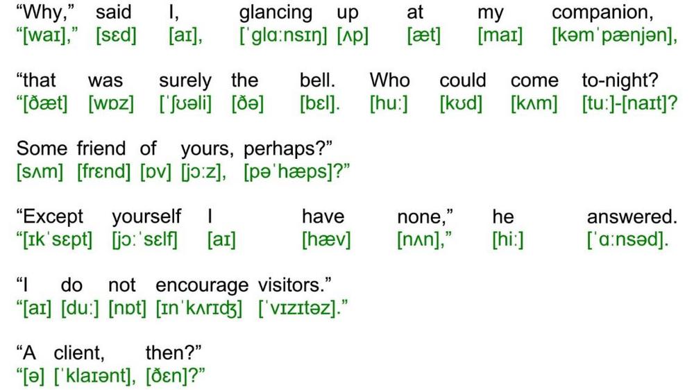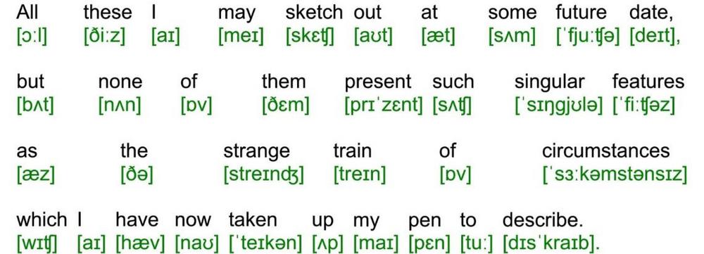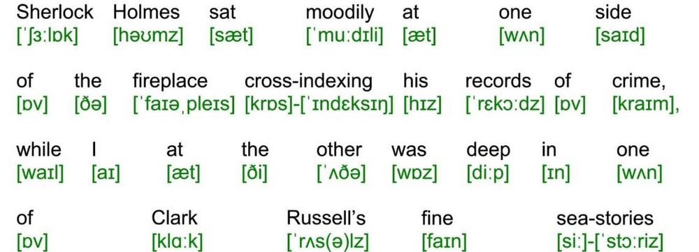 Sherlock Holmes sat moodily at one side of the fireplace cross-indexing his records of crime, while I at the other was deep in one of Clark Russells fine sea-stories until the howl of the gale from without seemed to blend with the text, and the splash of the rain to lengthen out into the long swash of the sea waves.