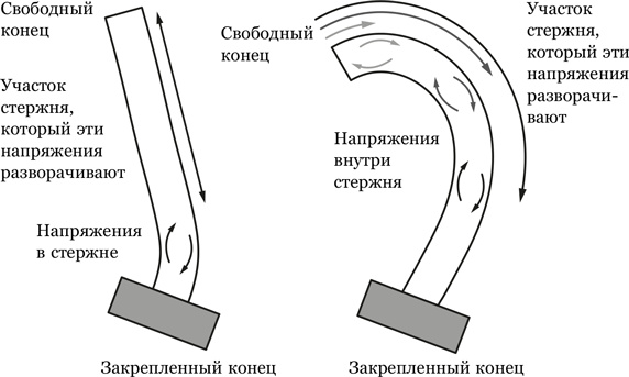 Рис. 3.Слева: упрощенный пример, в котором выпрямляющие напряжения присутствуют только в основании и разворачивают стержень фиксированной длины. Справа: реальная ситуация, при которой напряжения присутствуют сразу везде и действуют на участки стержня разной длины