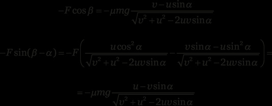 Сила трения, действующая на этот участок, по модулю равна F = μmg (здесь m масса участка кольца) и направлена в противоположную от скорости сторону. У этой силы есть проекция на направление поступательного движения, F cos β, и проекция на касательную к кольцу, которая притормаживает вращение, F sin (β α). Не стесняясь, подставим сюда выражения для синуса и косинуса угла β, а также учтем, что sin (β α) = sin β cos α cos β sin α: