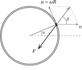 РешениеРассмотрим участок кольца, который находится под углом α к направлению движения (рис. 2). Пусть в данный момент времени скорость центра масс кольца равна v, а скорость вращения обода u = ωR, где ω угловая скорость вращения в данный момент, а R радиус кольца. Этот кусочек кольца участвует в поступательном и вращательном движении. Его скорость относительно поверхности показана на рисунке серой стрелкой. Она составляет угол β с направлением поступательного движения, причем
