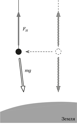 ЗадачаДавайте рассмотрим совершенно гипотетическую, даже фантастическую постановку задачи: имеется математический маятник, длина его подвеса безумно велика и во много раз превышает радиус Земли. Сам точечный грузик при этом находится в лаборатории на уровне земли, но только точка подвеса унесена далеко даже так: сколько угодно далеко в космос! Для простоты будем считать, что Земля и точка подвеса неподвижны. Это, конечно, слегка безумная и совершенно нереализуемая на практике ситуация, но мы имеем право рассмотреть такой мысленный эксперимент.