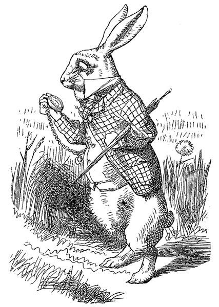 В цьому не було нічого ТАКОГО ВЖЕ незвичайного; Аліса не те щоб ТАК УЖЕ здивувалася, почувши, як Кролик мурмотить сам до себе: «Ой лишенько! Ой лишенько! Я запізнюся!» (Міркуючи про це згодом, вона подумала, що насправді-то мусила остовпіти, але на той момент усе виглядало цілком природно.) Та коли Кролик на додаток ВИТЯГНУВ ГОДИННИКА З КИШЕНІ ЖИЛЕТКИ, глипнув на нього й заквапився далі, Аліса миттю зірвалася на рівні ноги: її осяяло, що раніше вона ніколи не бачила кролика з жилетною кишенею або ж із годинником, якого можна з тієї кишені витягти. Тож, палаючи з цікавості, дівчинка припустила за ним через галявину й, на щастя, саме встигла побачити, як він шугнув у величеньку кролячу нору попід живоплотом.