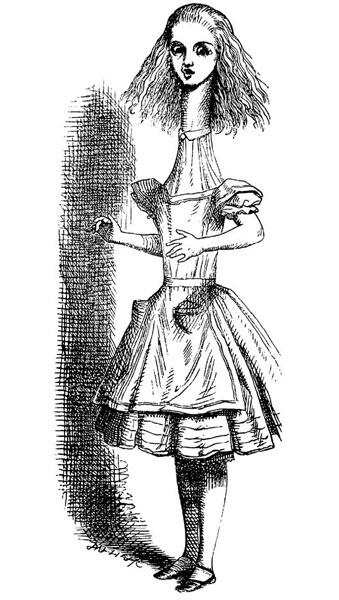 Аліса підібрала впущені речі, а оскільки в залі була страшна задуха, то почала обмахуватися віялом, примовляючи між тим:
