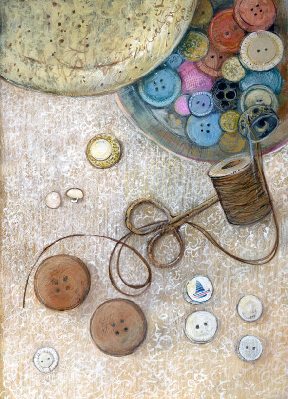 Хозяйка водила рукой по рассыпанным на столе застежкам, пока не выбрала две древние большие коричневые деревянные пуговицы от зимнего старого драпового пальто.