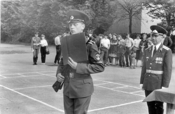 Знаменная группа занимает свое место на правом фланге. Перед строем устанавливают покрытые красным сукном столы. На них, в красных кожаных папках, текст Присяги и подписные листы. У столов начальники курсов. «Курсант Келпш, для принятия Военной Присяги выйти из строя!» Чеканю шаг изо все сил, поворот кругом у стола, в руках папка с текстом Присяги.
