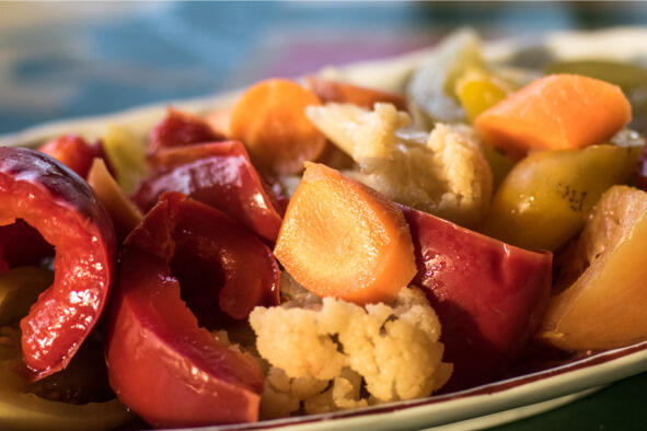 В Болгарии есть две холодные закуски, которые едят только зимой и принципиально не употребляют в другие времена года. Это кисело зеле квашеная капуста и туршия. По большому счету, это ассорти болгарских маринованных овощей. Три вида присутствуют обязательно цветная капуста, морковь и разноцветный сладкий перец. Кроме того, в туршию добавляют зеленые помидоры, кабачки, бамью, зелень, черный перец кто во что горазд.