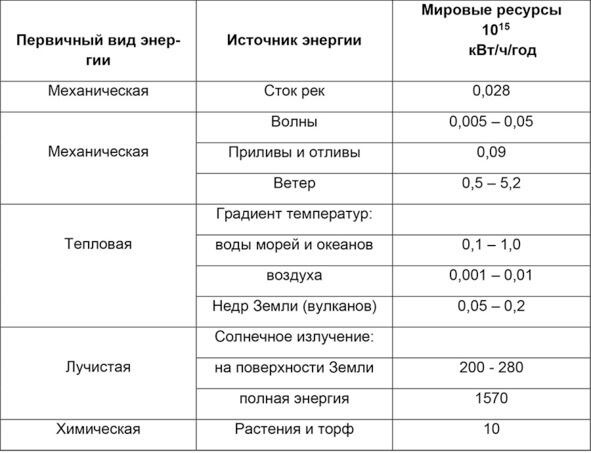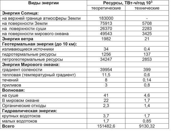 Таблица 4. Ресурсы ВИЭ в мире [107]