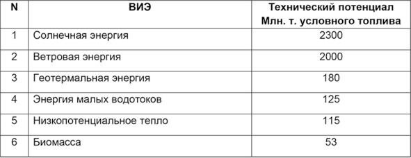 Табл. 5. Традиционные ресурсы возобновляемых источников энергии (ВИЭ) в России по данным Института теплофизики СО РАН [92,93,94]