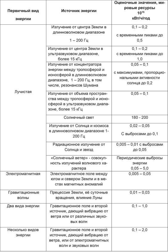 Кроме традиционного солнечного светового излучения, в табл. 4 приведены и нетрадиционные виды энергии, которые в настоящее время используются редко. Тем не менее, в древних цивилизациях, в мегалитических сооружениях Земли они активно используются или использовались ранее. Технический потенциал в табл. 6 указан условный или оценочный, сделанный автором, А. Матанцевым.