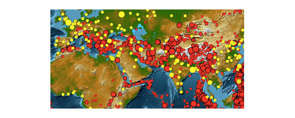 Теперь, по этой карте на рис. 26, сравнивать существенно легче. Из неё видно, что на всех завоеванных зонах сейсмическая активность высокая, она отображается красно-коричневыми кружочками. В области расположения Индии, в основном кружочки желтого цвета, это означает, что здесь сейсмичность низкая.
