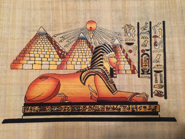 Пример 11, рис. 14. Еще один древний папирус показан на рис. 14. Интересна общая композиция. Сверху справа над пирамидами и Сфинксом летит птица, в когтях которой символ вечности. Это сделано для нас, будущих поколений. Представители древних цивилизаций дают нам подсказку о времени действия пирамид и Сфинкса. Интересно и необычное шашечное покрытие пирамиды. С левой стороны показано Солнце, как источник энергии. Всего здесь три профиля пирамид: малого размера, побольше и совсем большого. Это еще одна нам подсказка: все пирамиды Гизы, и большие, и малые, запитывались от солнечного излучения. Напротив лица Сфинкса расположены трое богинь. У одной в руках сосуды, у другой в руках цветы, у третьей жезл уас. Всё это свидетельствует о воздействии от Сфинкса как на состояние природы и загрязнение атмосферы, так влияние на природу и на управление действием жезлов типа уазов, анхов и других.