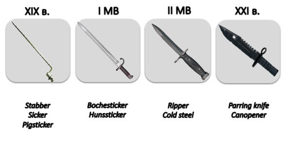 Так, в ходе войн середины ХIХ- начала ХХ века штык являлся одним из самых распростаненных видов оружия. Отсюда множество его сленговых названий, образованных в основном путем словосочетаний с sticker (шип, колючка) и stabber (например, pig sticker -«свинокол»). В Первую мировую войну к ним добавляются слова boche, Hun, Jerry сами по себе являющиеся сленговыми обозначениями немцев. В годы Второй Мировой войны на вооружении американской армии состоит штык ножевидной формы это уже не только оружие, но и много-функциональный инструмент кусачки для колючей проволоки, пила с мелкой насечкой. С развитием артиллерийского и стрелкового оружия боевое значение штыка снижается, а вместе с тем меняется и коннотация его сленговых отражений. Именно поэтому в этот период появляются сленгизмы ripper (потрошитель), parring knife (нож-пилка для овощей). А в сленге периода Вьетнамской войны штык обозначается уже ничем иным как can opener (открывалка для консервов).