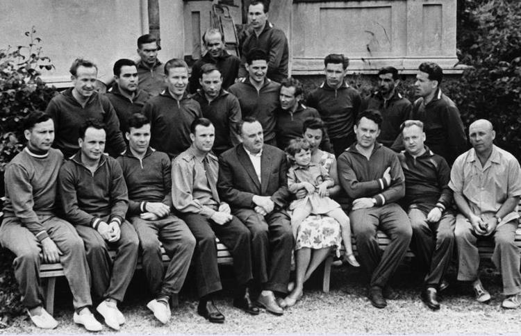 Сидят в первом ряду слева направо: Павел Попович, Виктор Горбатко, Евгений Хрунов, Юрий Гагарин, Сергей Королёв, его жена Нина Королёва с дочкой Поповича Наташей, Евгений Карпов (начальник Центра подготовки космонавтов), Николай Никитин (тренер по парашютной подготовке), Евгений Фёдоров (врач).