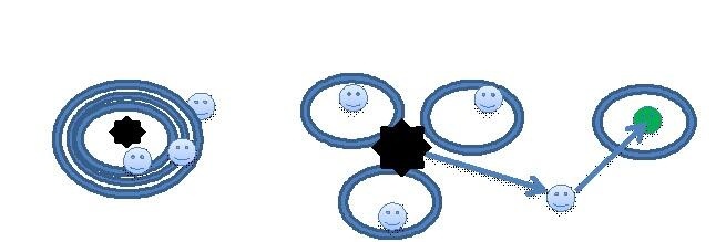 Здесь все ясно черные восьмиугольники отношения Иерархии (равенства) слева в достаточно сложном Узоре типа Узора власти. Посередине при создании и реализации собственных Узоров здесь они возникают при сравнении нашего «дома» и «дома» соседей. А правый вариант использование энергии аккумулятора Иерархии для создания Солитона который в дальнейшем будет раскручивать Узор сам.