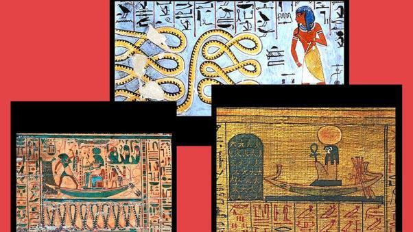 Если Осирис умирает и воскресает ежегодно, то Ра ежедневно, потому что по одной из версий, вечером его пожирал змей Апоп. По другой, более популярной, днем Ра плывет по небесному Нилу в барке Манджет, а вечером пересаживается в барку Месектет и спускается в преисподнюю. Там он плывет по подземному Нилу, сражается с Апопом, а утром снова меняет барку. Египтяне верили в победу Ра, но никогда не знали точно: наступит завтрашний день или нет.