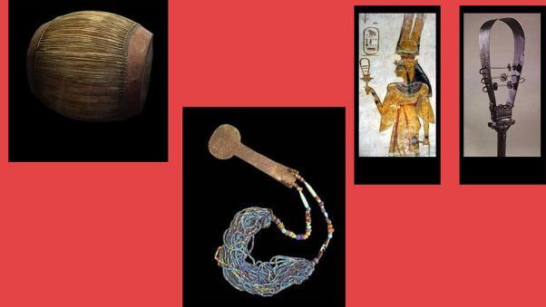 Среди музыкальных инструментов самый древний арфа, придуманная в Египте. Еще играли на тамбуре, лире, тамбурине, флейте, трубе, барабане, систре, менате и др. Два последних это погремушки, которые имитировали шорох зарослей папируса.