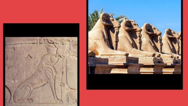 Затронув тему изобразительного искусства, нельзя не сказать о сфинксах. Если Вы думаете, что он был один, то ошибаетесь. Это достаточно распространенный мотив древнеегипетского искусства: существа с телом льва и головой человека, сокола или барана. Последний символизировал бога Амона. Аллеи таких скульптур сохранились около Карнакского храма. Сокол это воплощение Гора. Таких сфинксов можно увидеть на стенах храмов, посвященных этому богу.