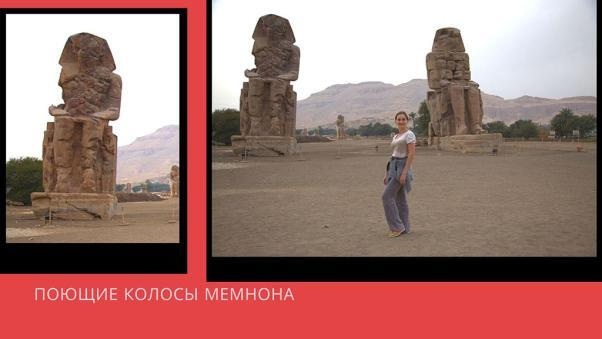 Еще две скульптуры, на которых я хочу остановить Ваше внимание, это гигантские статуи фараона Аменхотепа III, созданные в XIV в. до н.э. и расположенные недалеко от храма царицы Хатшепсут. Когда в результате землетрясения I в. н.э. один был поврежден, то на восходе солнца стал издавать звук. Вероятно, его причиной была резко испаряющаяся роса. По этому звуку настраивали музыкальные инструменты. За это скульптуры получили второе греческое название "поющие колоссы Мемнона", в честь мифического царя, сына богини утренней зари Эос. Однако после реставрации, проведенной по приказу римского императора Септимия Севера в конце II в., звуковой эффект исчез.