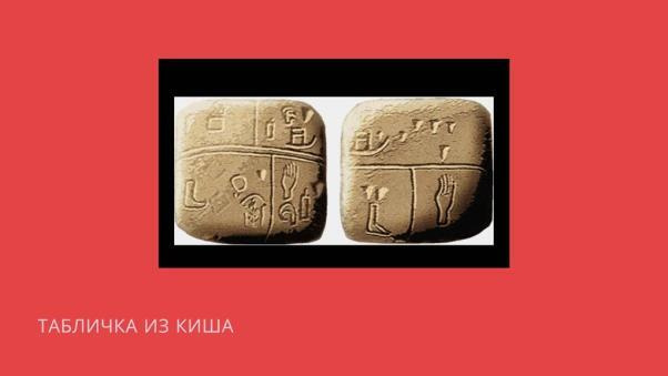 Памятники шумерской письменности являются древнейшими в мире. Табличка из города Киша датируется примерно 3500 г. до н. э. это еще пиктографическое рисуночное письмо.
