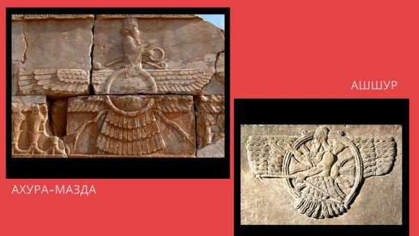 В зороастризме можно обнаружить идеи типичные для религий I тыс. до н.э. Например, посмертный (первый) суд над умершим, непорочное зачатие, мы уже встречали в представлениях древнего Египта. И, даже, изображение зороастрийского Ахура-Мазды похоже на ассирийского Ашшура. Их названия звучат похоже Ашшур и Ахура, и переводятся одинаково бог.