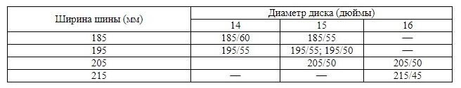 Завод допускает установку шин с другими маркировками. В таблице показаны разрешенные размеры шин.