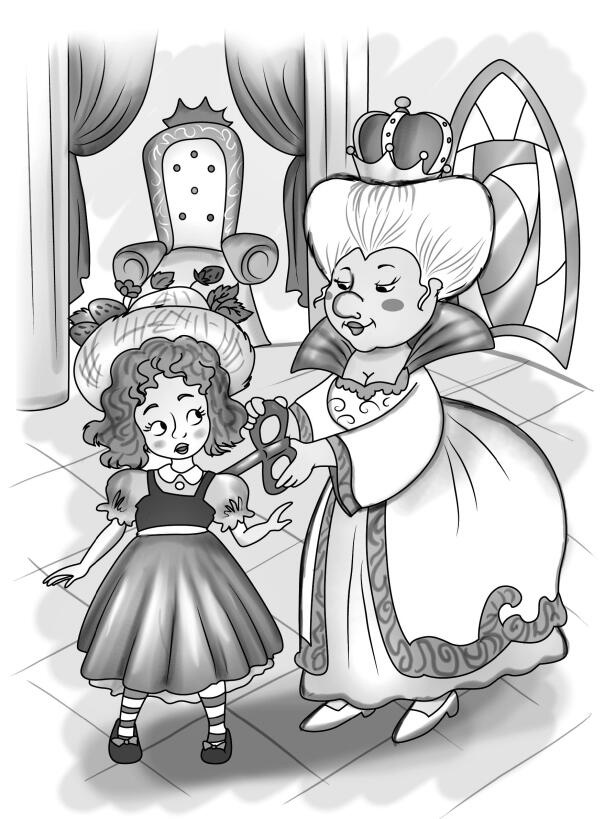 София надела тапочки и взялась за медведицу, как та сказала. Комната закружилась, поплыла, растаяла. Они очутились на базарной площади среди торговцев. Но что это? Медведица на глазах начала превращаться в толстую королеву. Она была одета в белое платье, а белоснежные волосы, уложенные вокруг головы, венчала корона. Королева топнула ногой и три раза звонко хлопнула в ладоши.