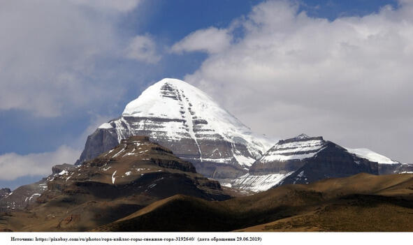 На юге Тибетского нагорья в системе горных хребтов Гандисышань находится самая высокая гора этого района Тибета. Она весьма выделяется среди прочих вершин не только шестью с половиной километрами высоты, но и четырёхгранной пирамидальной формой, как будто её вылепили словно гигантский куличик! Вот она, смотри, какая необычная! Четыре грани эти подозрительно точно ориентированы на современные четыре стороны света: север, восток, юг и запад. Необычно и то, что южная сторона этого пирамидального великана, которого называют Кайлас европейцы и Гандисышань, или Ганжэньбоуи, китайцы, поделена на две равные половины вертикальной трещиной, которая, в свою очередь, по центру пересечена горизонтальной трещиной, что очень напоминает древний солнечный символ, использовавшийся людьми ещё в древнейшие времена. Может быть, недаром в древних рукописях на тибетском языке эту гору называют Канг Ринпоче «Драгоценная снежная гора», а некоторые верующие Непала и Китая считают гору священной и поклоняются ей. Верующие четырёх религий (индуисты, буддисты, джайны и бон) считают Кайлас «сердцем мира», «осью земли». Легенды говорят о том, что Кайлас не любит человеческого вмешательства и сбрасывает тех, кто смеет взбираться на его вершину, а у тех, кто прикоснулся к горе, появляются язвы, не заживающие несколько недель. Вместе с горой верующие почитают два не менее странных озера, находящихся неподалёку: Мапам-Юмцо озеро с пресной водой, озеро Жизни и Ланга-Цо солёное озеро, озеро Смерти, потому что вода в нем солонее бабушкиного супа, и жить в ней никто не может. Вот такие чудеса природы!