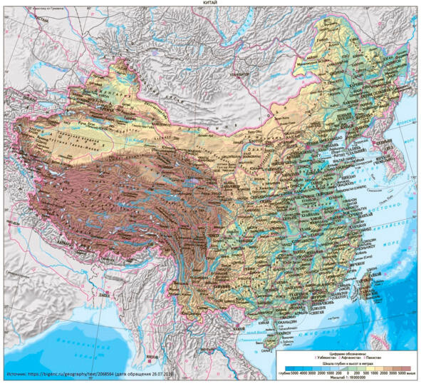 Посмотри на эту карту: вот Китай. Страна расположена в Центральной и Восточной Азии так называем мы часть земного шара. С восточной стороны Китай омывается водами западных морей Тихого океана: Восточно-Китайским морем, Корейским заливом, Жёлтым морем, Южно-Китайским морем, остров Тайвань разделён с материком Тайваньским проливом, а остров Хайнань проливом Цюнчжоу.