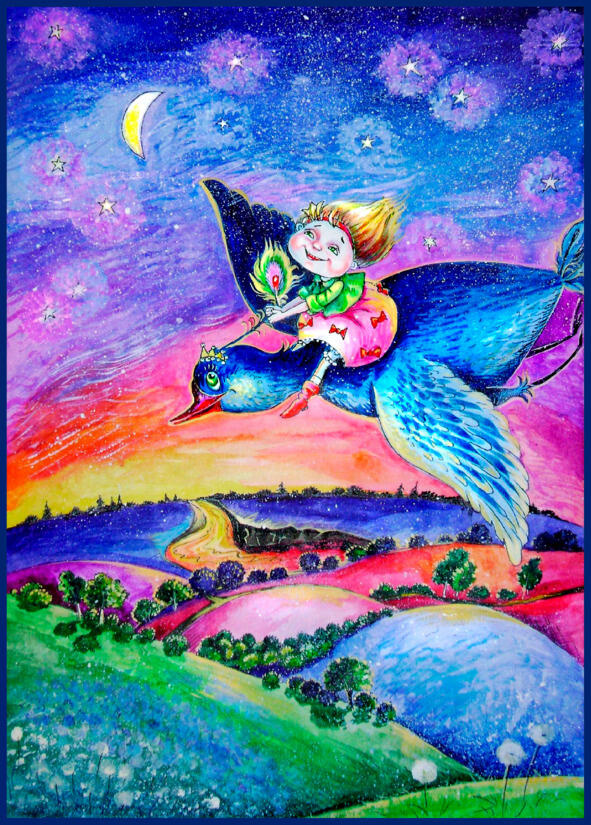 Птица подставила крыло и помогла девочке взобраться. Улыбника обняла птицу за шею, и они взмыли ввысь.