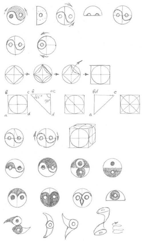 Из этих тайн древних Мистерий обычным людям, доступна была только символика, когда символы выполняют двойную роль, сокрытия священных истин от непосвящённых и в то же время открытия этих истин тем, кто понимает символизм. Так организовывались содружества людей, понимающих скрытую символику, в которую имела доступ философская элита. И все языческие племена и народы имели не только государственную религию, но и другую, к которой имела доступ только философская элита, сохраняющая тайны древних культов, благодаря чему Мистические символы сохранились до сих пор. Со временем многие Мистерии были извращены, превратились в разные направления вакханалий. Инициированные служители Мистерий, пытаясь спасти секретные доктрины, помещали свои знания в самых различных местах, об этом мы сможем убедиться при детальном изучении религиозных источников. Например, даосского символа Инь-Янь. В том, что знания сохранены, любой желающий может лично убедиться, взяв в руки карандаш и линейку, «пообщаться» с изображением знака беспредельности (Даосский символ Инь-Янь). Определить реперные точки и отправиться в путь созидания. Потому что это не просто значок, обозначающий фигуру, здесь можно увидеть квадрат, сегмент, треугольник и многие другие варианты вычисления площадей разных геометрических фигур. Здесь можно увидеть начальный вариант построения ромба, сочетание Пифагоровых чисел и принцип построения «Пифагоровых штанов», где квадрат гипотенузы равен сумме квадратов катетов. Здесь видно понятие шара и вращения. Хорошо отслеживаются понятия куба, а шар, заключенный в кубе, дает проекцию цилиндра, вычисляются понятия конуса, пирамиды. Здесь можно увидеть понятие симметрии и разных прикладных знаний, Архимедов винт и др.