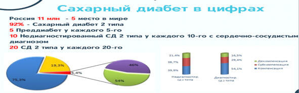 По данным проведенного в России исследования NATION (20132015гг) цифру официальной статистики можно смело увеличивать минимум в 2 раза, т к большинство пациентов не подозревают о наличии у себя такой патологии. Заболевание развивается медленно, годами, организм адаптируется к такому метаболизму, и мы выявляем СД 2 типа или при случайном обследовании или в стадии выраженной декомпенсации, когда сахар крови выше 1213 ммоль/л, и человек точно чувствует себя больным.