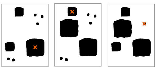 б). Инверсия или контраст цвета (выделение на нюансе). Можно выделить пятно в качестве композиционного центра, не убирая подобные ему. Возьмем плоскость, на которой присутствуют по несколько пятен каждого размера. Если на одно из больших черных пятен мы поместим маленькое белое пятно, большое черное пятно начнет выделяться среди подобных ему, на нем есть акцент, которого нет на других пятнах. В то же время, маленькое белое пятно тоже будет выделено среди маленьких пятен только оно одно белое.