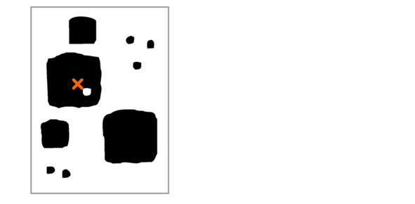 Возникает вопрос: что же является композиционным центром большое черное пятно или маленькое белое пятно на нем? Композиционный центр не является пятном. Это точка, некий центр равновесия в пятне, как если бы мы прикололи это пятно булавкой к вертикальной плоскости. В данном случае мы имеем два пятна и композиционный центр находится где-то на линии, соединяющей их центры. Эту схему с булавками для обозначения композиционного центра мы будем использовать далее, так как она дает некоторую наглядность.
