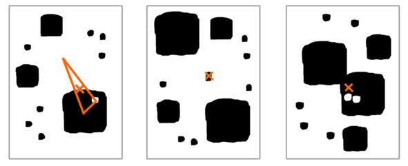 В примере справа композиционный центр находится в независимой части большого черного пятна. Эта часть отделена небольшими белыми пятнами. Здесь эти белые пятна не воспринимаются как акценты, все вместе они создают отсекающую линию. Здесь мы видим в действии принцип непрерывности из гештальтпсихологии.