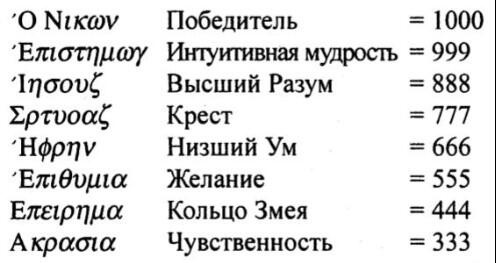 С небольшими отличиями от указанной схемы, но следуя тому же методу, следующие каббалистические значения были выявлены в Апокалипсисе1: