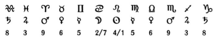 Каббала, несущая в себе тайное значение, может принимать разные формы буквенные, числовые или иероглифические; так как сейчас нас в основном интересует природа и сила чисел, мы должны придерживаться рассмотрения их числовых форм и отношений с буквенной формой, а также возможностей их применения на практике. В связи с этим нам нужно использовать символику, относящуюся к планетной системе. Поэтому уместно здесь перечислить планетарные числа, как они даются Джоном Хейденом в его Священном Путеводителе: