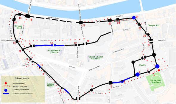 Далее вдоль осовремененной городской стены доходим до пересечения с Bride Street. В средневековье здесь можно было попасть в город через Ворота Pole Gate(5), которые были построены в 1356 году и названы так по имени церкви Saint Michael le Pole, которая находилась в этом месте. Во время раскопок были найдены могилы, датируемые 8 веком, что говорит о том, что люди здесь жили задолго до прихода викингов.