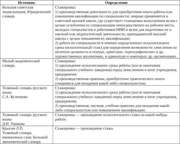 В статье «Организация стажировок как одна из важных составляющих подготовки научных кадров (опыт ИСЭРТ РАН)»6 авторы анализируют подходы к определению понятия «стажировка» (таблица 1) и делают выводы, что «стажировка в ее теоретической основе трактуется одинаково. На практике же под стажировкой часто понимают совершенно разные явления: в ряде случаев это неотъемлемая часть учебной программы, в других профессиональная подготовка, необходимая для присуждения определенной квалификации»7.